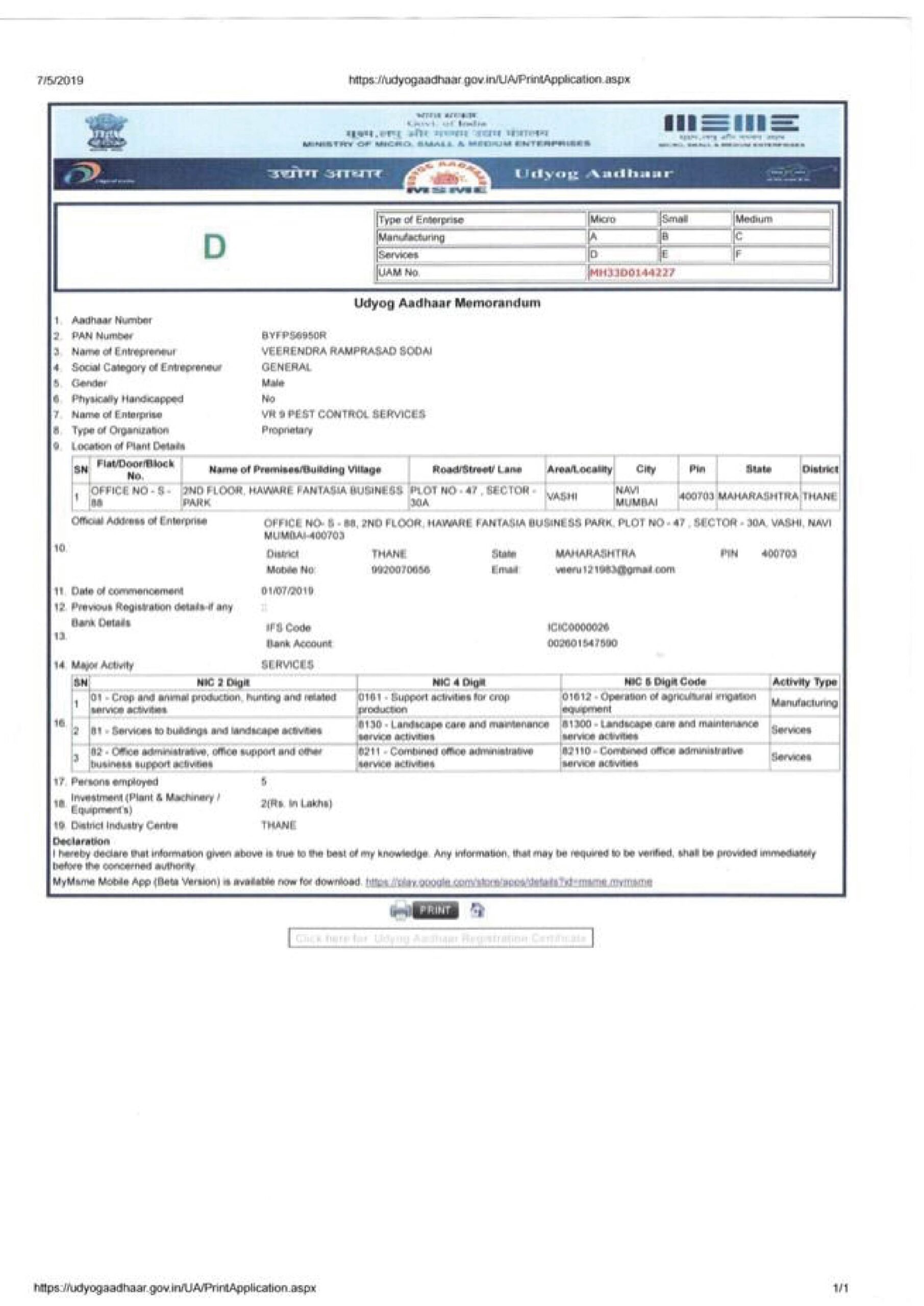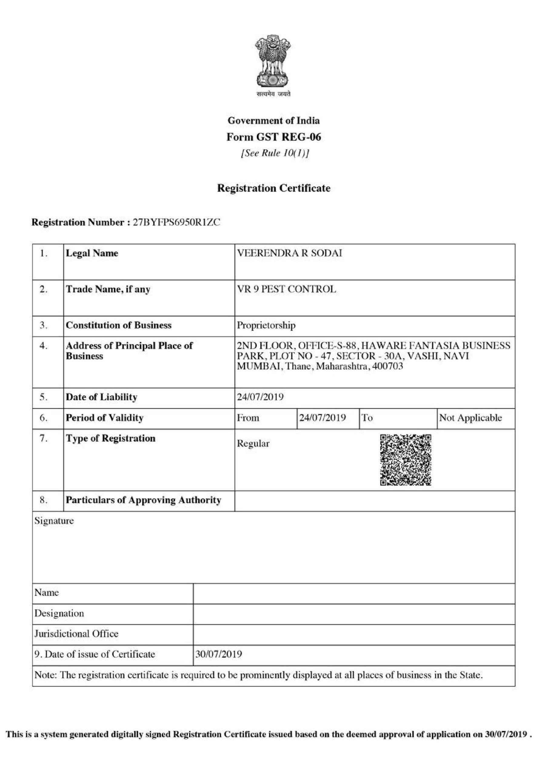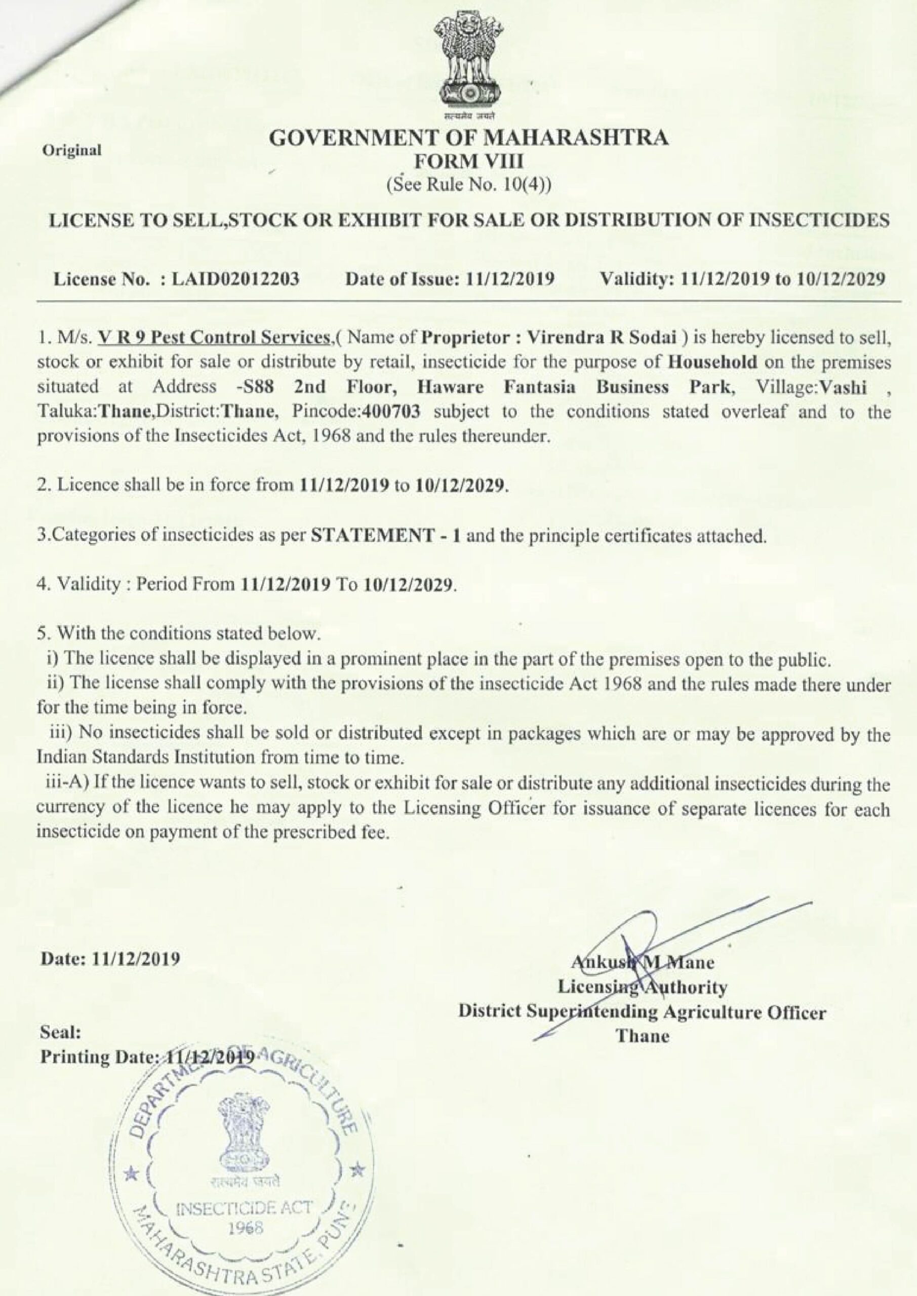 - VR9 is one of the leading pest control services company in 2018-19 and with MSME & GST certified organization.